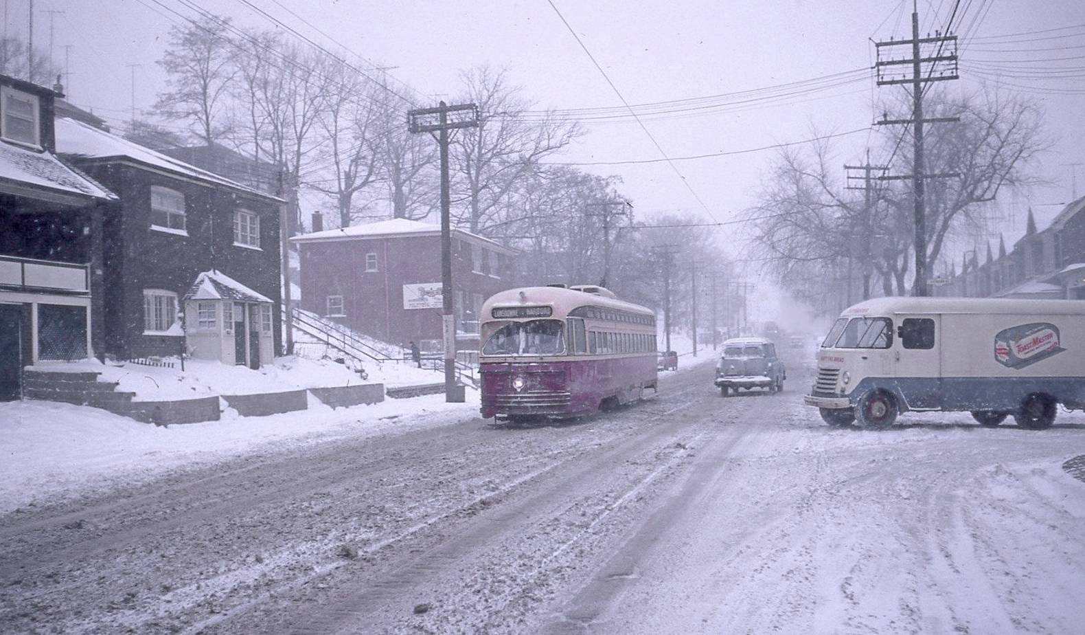 1965 A Toronto PCC Streetcar and a Toastmaster Bread Truck navigating the winter roads