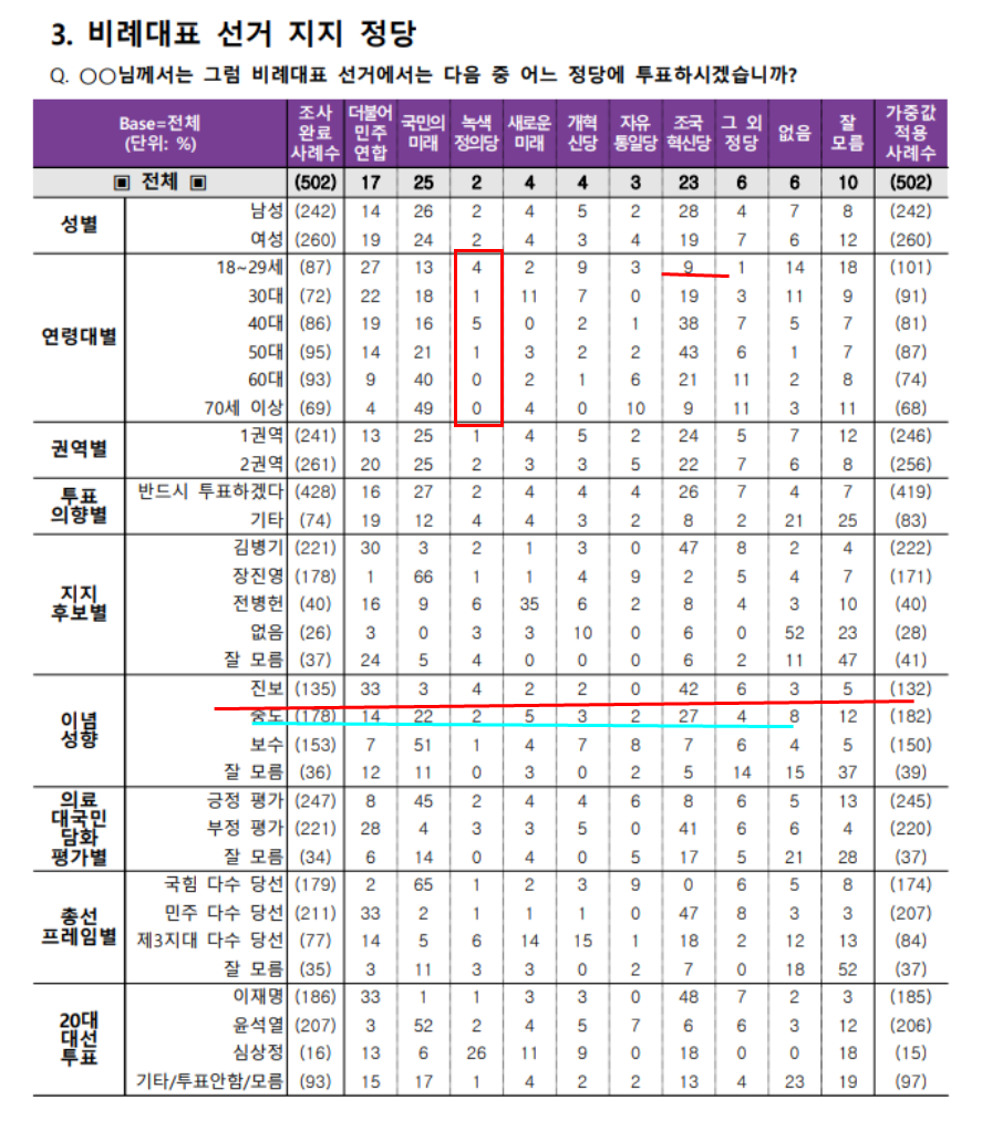 2) 중도층 22%가 국힘위성정당에 정당투표. 극우 자유통일 2%, 조국혁신 27, 민주위성 14 ( 41%), 중도층 나머지 35%는 다른 정당들에 투표.