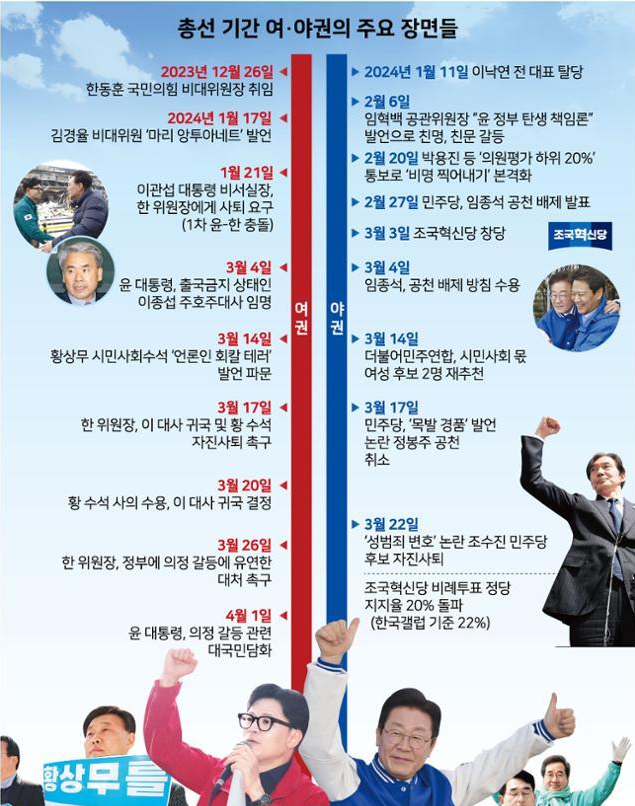 2월 설날까지 한동훈과 국민의힘의 지지율이 올랐지만, 공천 갈등, 황상무 회칼 테러 발언, 이종섭 호주런 사건을 기점으로 '윤석열 정권 심판론'이라는 기본축이 다시 살아남.