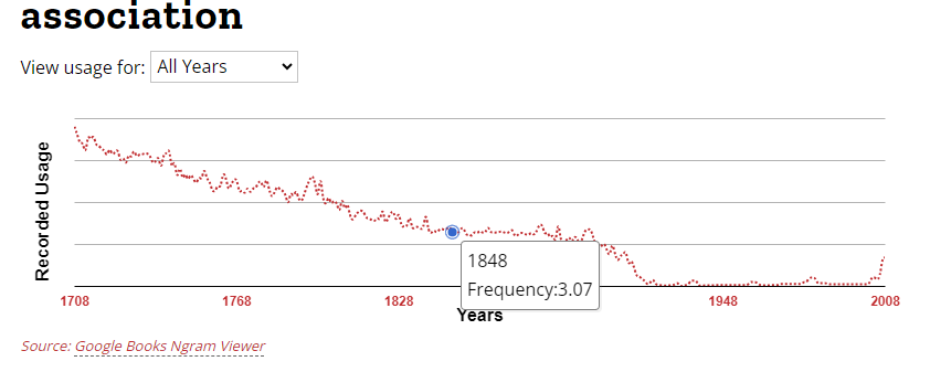 association 단어 사용 빈도수. 1535년부터 사용, 1708년 ~ 1848년까지 상당히 많이 사용되었던 단어.