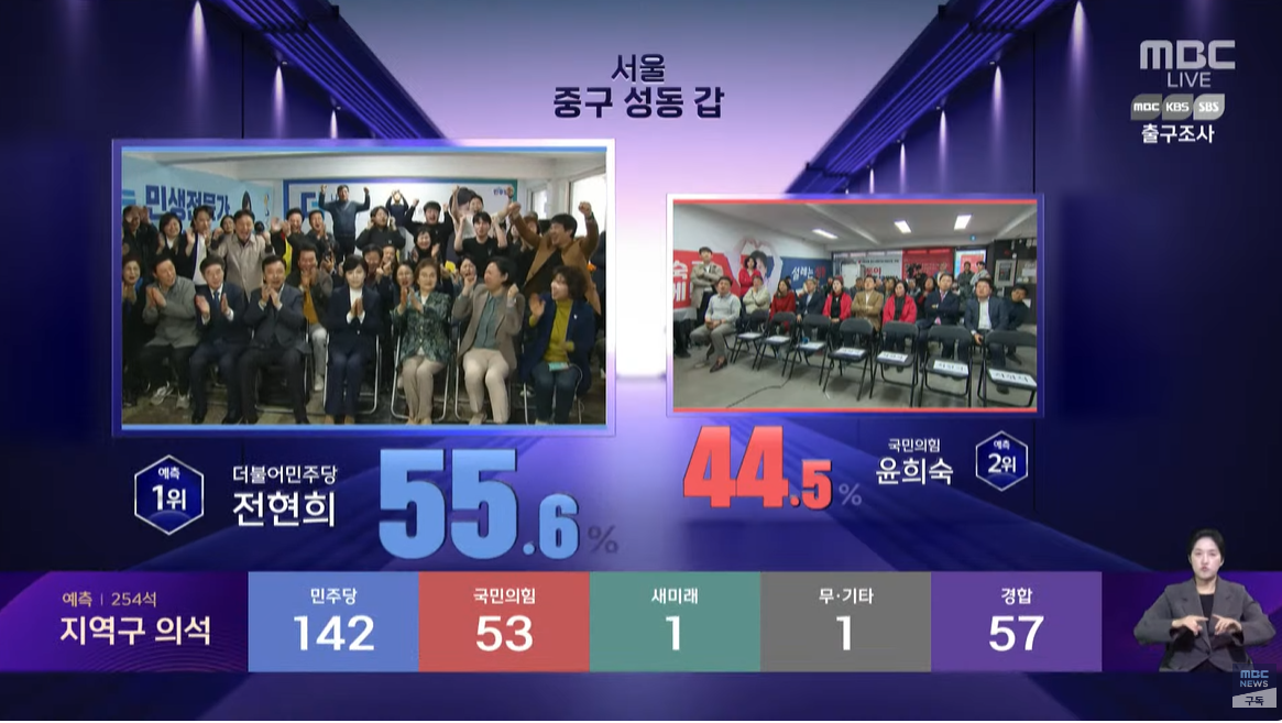 | 2024년 410 총선 서울 동작을 출구조사 류삼영 52.3%, 나경원 47.7%"[지상파3사 출구조사] (0) | 2024.04.10 |