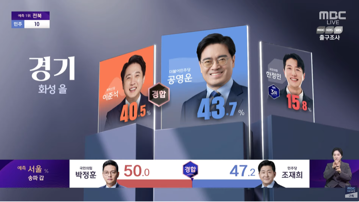 410 총선 출구조사. 경기 화성을 민주당 공영운 43.7, 개혁신당 이준석 40.5, 국민의힘 한정민 15.8