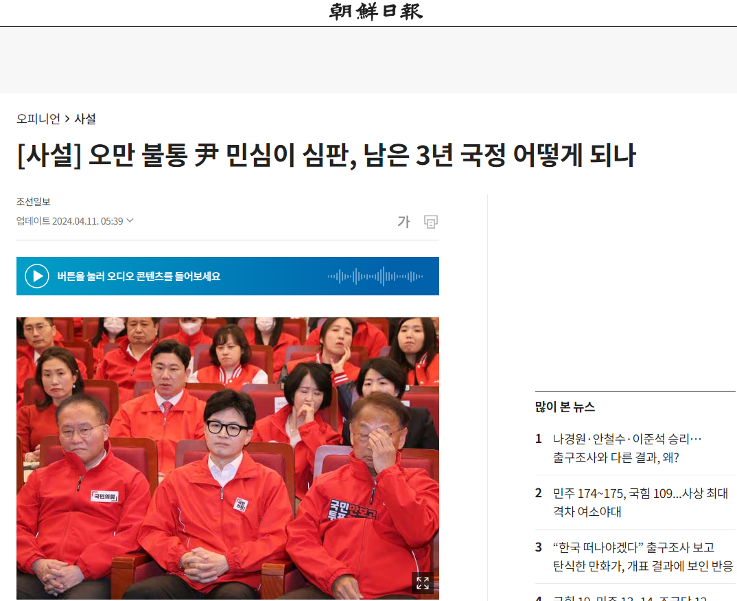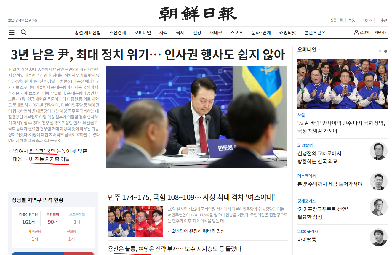 410 총선 결과. 국민의힘 참패 원인을 조선일보는 윤석열 '불통'과 김건희 리스크로 지적.