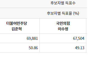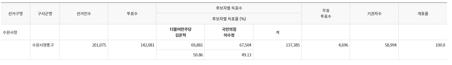 진보정당_리더십/2024년 총선 410 총선 결과. 대파 사건 국민의힘 이수정 경기 수원시정 낙선. 민주당 김준혁 50.86, 국민의힘 이수정 49.13 by 원시 2024. 4. 11. 410 총선 결과. 대파 사건 국민의힘 이수정 경기 수원시정 낙선. 민주당 김준혁 50.86, 국민의힘 이수정 49.13 공유하기 게시글 관리 한국정치 노트 Notes on the Politics of Korea 저작자표시 비영리 변경금지 (새창열림) '진보정당_리더십 > 2024년 총선' 카테고리의 다른 글 410 총선 결과. 22대 총선 대구 12명 전부 국민의힘 당선 (0) 2024.04.11 410 총선 결과. 강원도 8의석 중, 민주 2석, 국민의힘 6석 (0) 2024.04.11 410 총선 결과. 경남 16석 중, 민주 3석, 국힘 13석. 경남 창원시 성산구민주당 허성무 46.38, 국민의힘 강기윤 45.7, 녹색정의당 여영국 7.91 (0) 2024.04.11 410 총선 결과. 국민의힘 참패 원인을 조선일보는 윤석열 '불통'과 김건희 리스크로 지적. 남은 3년 임기 윤석열 레임덕 심각히 우려. (2) 2024.04.11 410 총선 결과. 경북 경산 국민의힘 조지연 43.43%, 무소속 최경환 42.27%, 녹색정의당 엄정애 6.29%, 진보당 남수정 7.99% (1) 2024.04.11 410 총선 최대 피해자, 하태경. '괜히 해운대구갑 포기했네?' 해운대갑 포기 서울행, 서울중구 성동을 경선에서 이혜훈에게 져,불공정 경선 이의제기 (0) 2024.04.11 410 총선 패배자, 국민의힘 김경율. 윤석열-김건희 비판했다가 후퇴 반복. 한동훈 지원 계속할 듯 (0) 2024.04.11 관련글 410 총선 결과. 강원도 8의석 중, 민주 2석, 국민의힘 6석 410 총선 결과. 경남 16석 중, 민주 3석, 국힘 13석. 경남 창원시 성산구민주당 허성무 46.38, 국민의힘 강기윤 45.7, 녹색정의당 여영국 7.91 410 총선 결과. 국민의힘 참패 원인을 조선일보는 윤석열 '불통'과 김건희 리스크로 지적. 남은 3년 임기 윤석열 레임덕 심각히 우려. 410 총선 결과. 경북 경산 국민의힘 조지연 43.43%, 무소속 최경환 42.27%, 녹색정의당 엄정애 6.29%, 진보당 남수정 7.99%