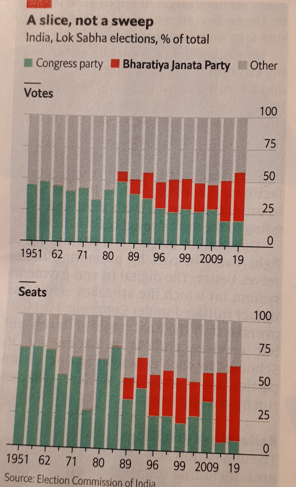 1) 인디아에는 두 개의 큰 정당들이 있다. 하나는 마하트마 간디 집안과 관련된 ‘콘그레스’와 현재 집권당 ‘바라티야 자나타 당’ (BJP)가 있다. 1억 8천만 당원 보유. (중국 공산당 당원이 9천 800만명과 비교) WhatsApp 과 소셜 미디어를 이용, 적극적인 당원 인입책. 그러나 인디아 남부에서 BJP인기가 없음 (130석 중, 29석)