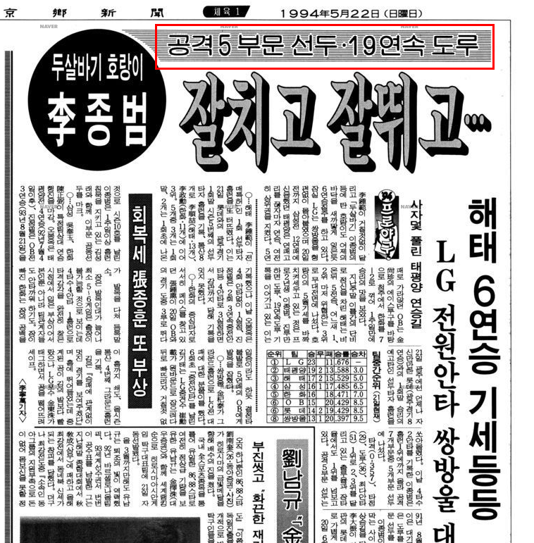 1994년 5월 22일. 이종범 공격 5부문 선두, 19연속 도루