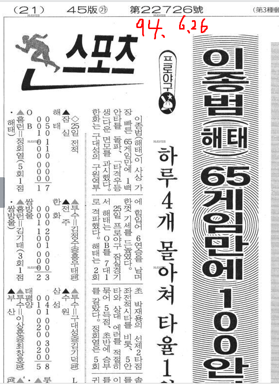 1994년 6월 25일. 65게임 만에, 이종범 100안타 달성.