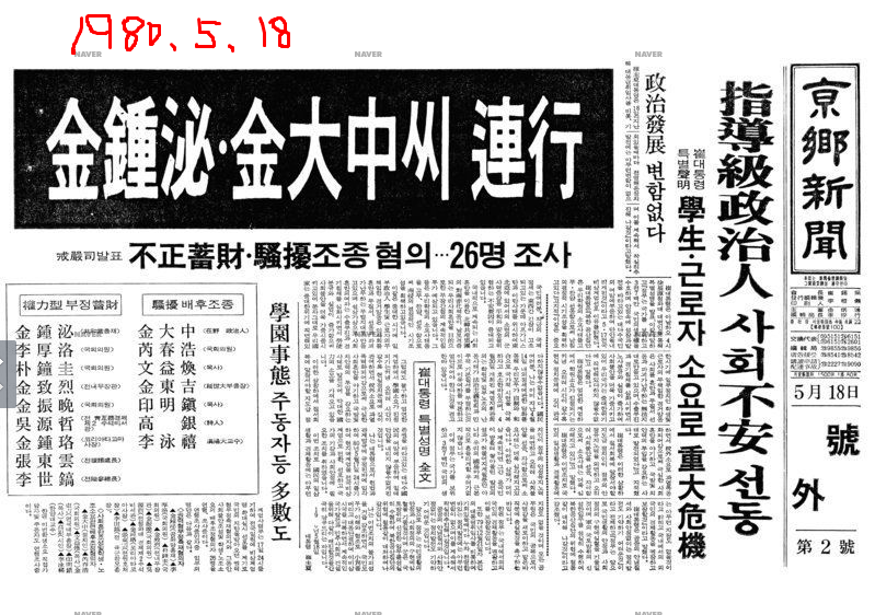 | 518 광주항쟁 당시 언론보도. 보도통제. 1980년 5월 19일 동아일보- 김종필 김대중 연행 보도. 518 광주 뉴스 전무. (0) | 2024.05.22 |