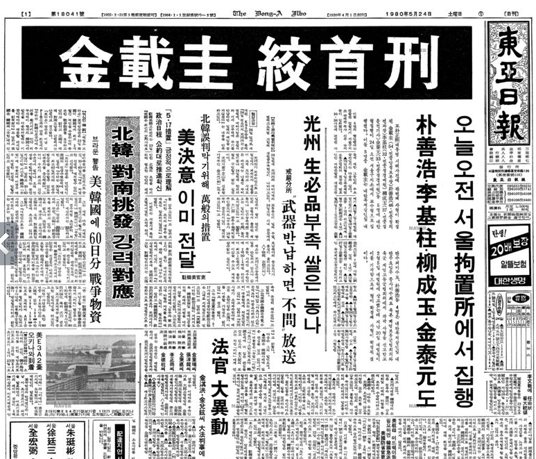 | 518 광주항쟁 당시 언론보도. 5월 27일 계엄군 광주 도청 장악, 시민군과 총격전. 동아 1면 '광주 계엄군 전격 진입' 제목 (0) | 2024.05.22 |