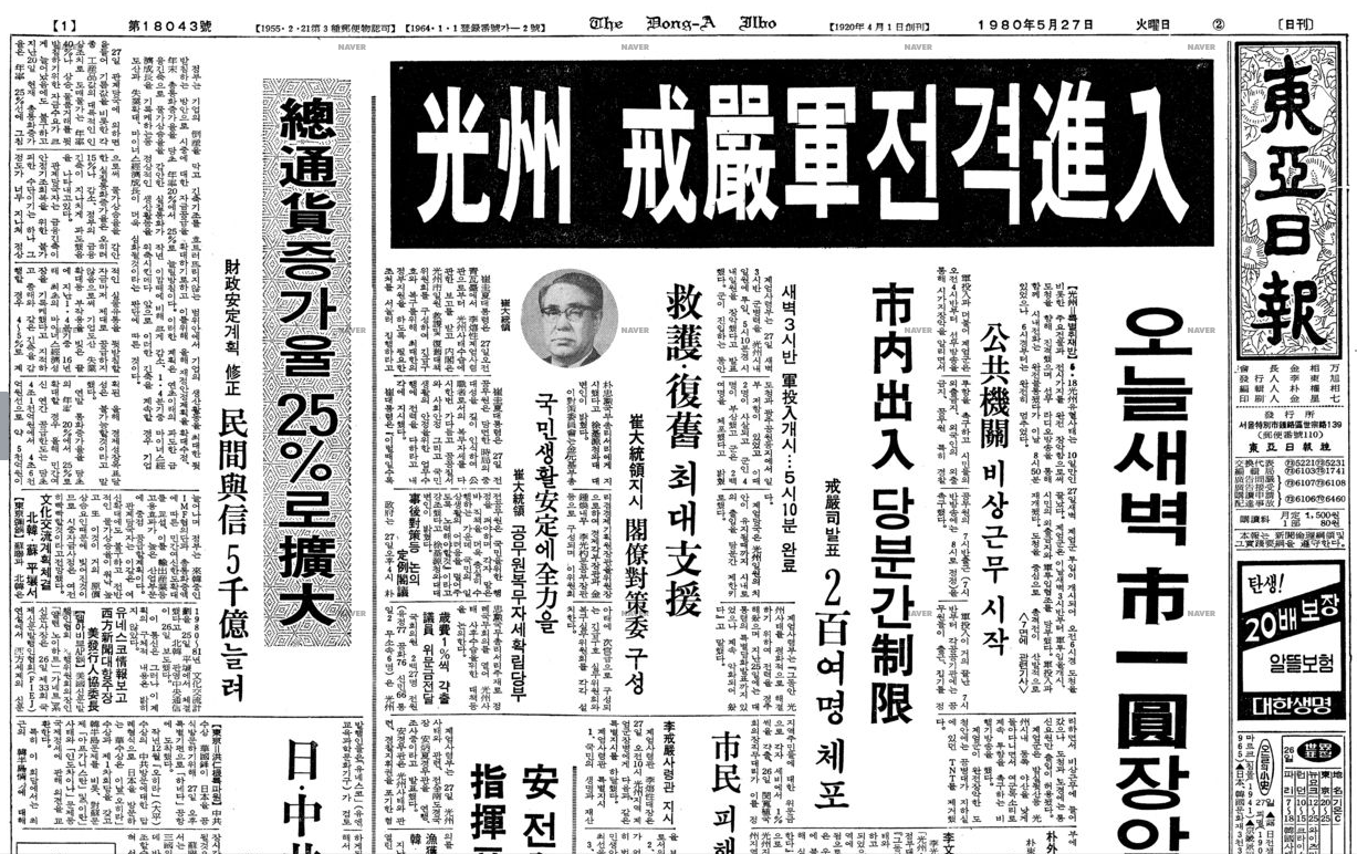 5월 27일 계엄군 광주 도청 장악, 시민군과 총격전. 동아 1면 '광주 계엄군 전격 진입' 제목