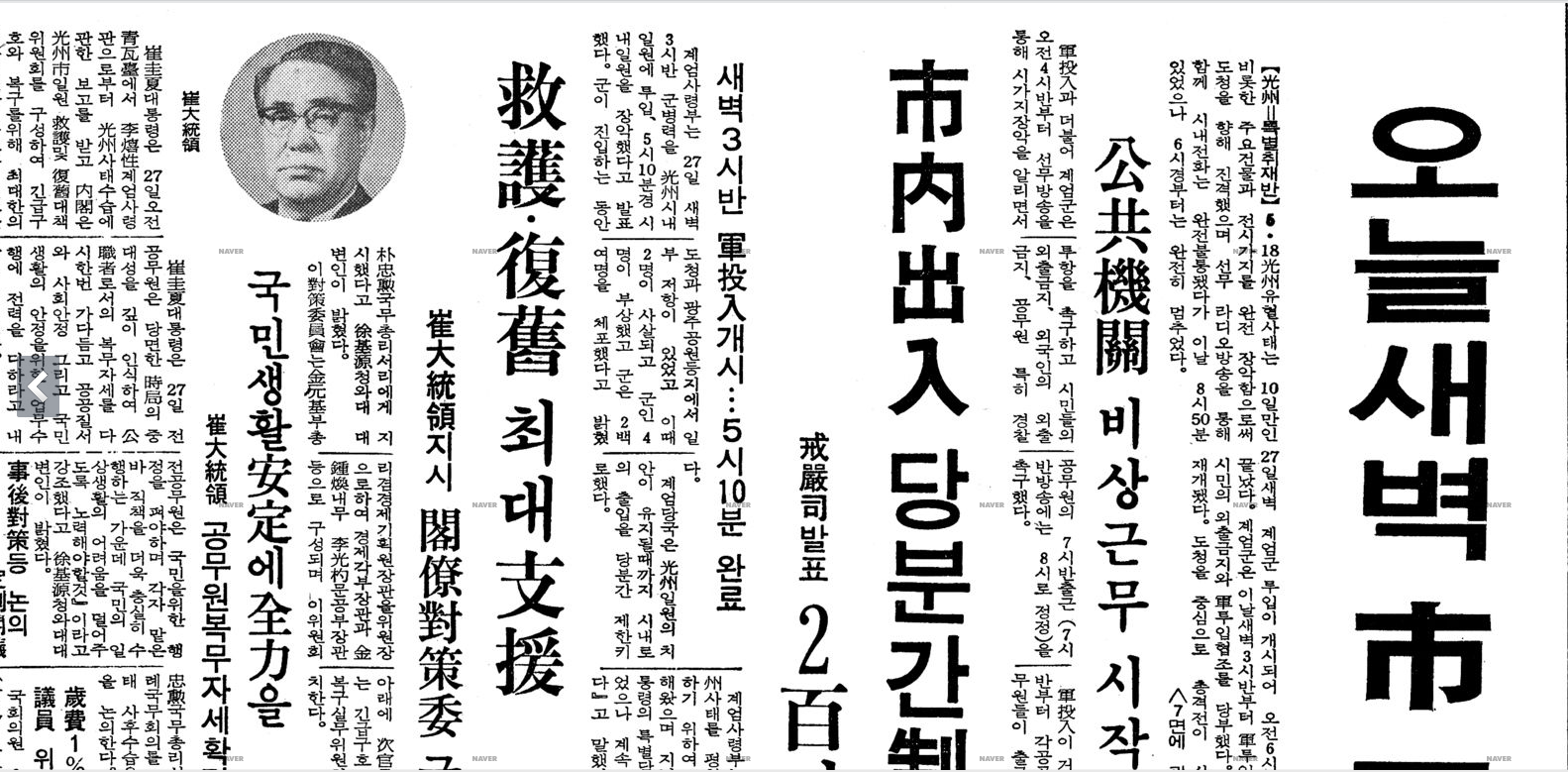 518 광주항쟁 당시 언론보도. 5월 27일 계엄군 광주 도청 장악, 시민군과 총격전, 다수 시민군 사망.