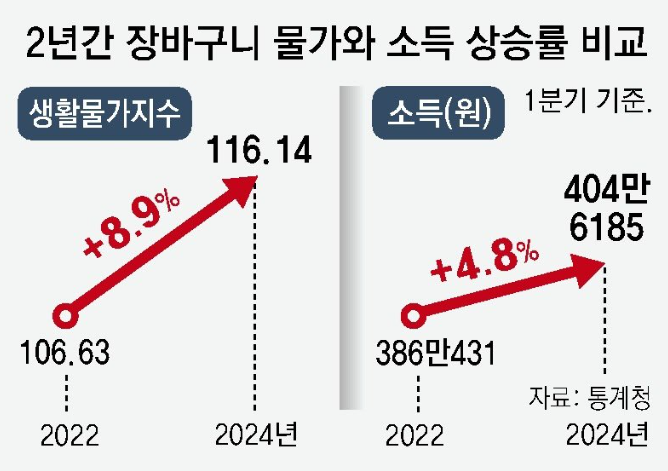 물가 상승세가 본격화된 최근 2년간 가계의 실질소득이 뒷걸음질친 것으로 나타났다. 가계 소득이 오른 폭보다 장바구니 물가가 두 배 가까이 더 뛰었기 때문이다. 영세 자영업자들의 벌이도 홀로 마이너스(―)를 보였다. 중동 안보 불안 등으로 물가 상승 압력이 이어지고 있어 당분간 가계의 팍팍한 살림살이가 지속될 것이란 우려가 나온다.
