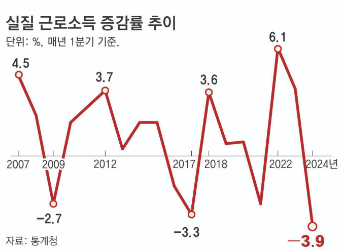 직장인들이 버는 근로소득은 월평균 329만1000원으로 1년 전보다 1.1% 줄었다. 근로소득이 감소세를 보인 건 코로나19로 고용이 위축됐던 2021년 1분기 이후 처음이다. 실질근로소득은 3.9% 줄어 감소 폭이 더 컸다. 실질근로소득 감소 폭은 관련 통계를 작성하기 시작한 2006년 이후 1분기 기준으로 가장 크다.
