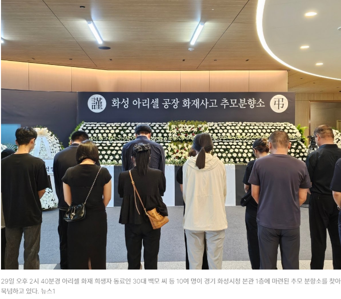 29일 오후 2시 40분경 아리셀 화재 희생자 동료인 30대 백모 씨 등 10여 명이 경기 화성시청 본관 1층에 마련된 추모 분향소를 찾아 묵념하고 있다. 뉴스1