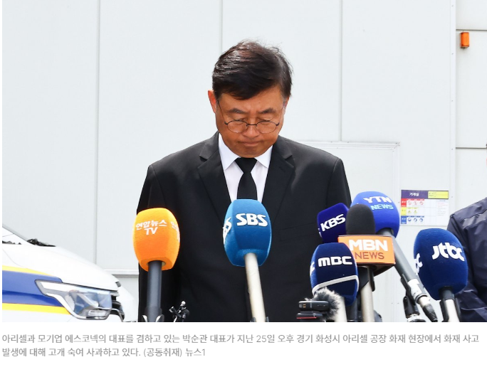 앞서 아리셀과 모기업 에스코넥의 대표를 겸하고 있는 박순관 대표는 사고 이튿날 화재 현장 앞에서 사과문을 낭독한 후 “일용직 노동자 불법파견은 없었다”며 “업무 지시는 파견 업체에서 했다”고 밝힌 바 있다.