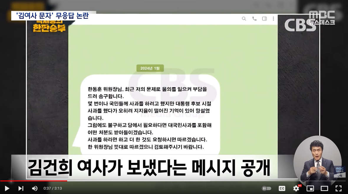 당시 김 여사가 보낸 메시지는 대국민 사과를 한다는 게 아니라 사실은 사과를 안 하겠다는 내용이었다며, 한동훈 후보가 정면 반박한 겁니다.