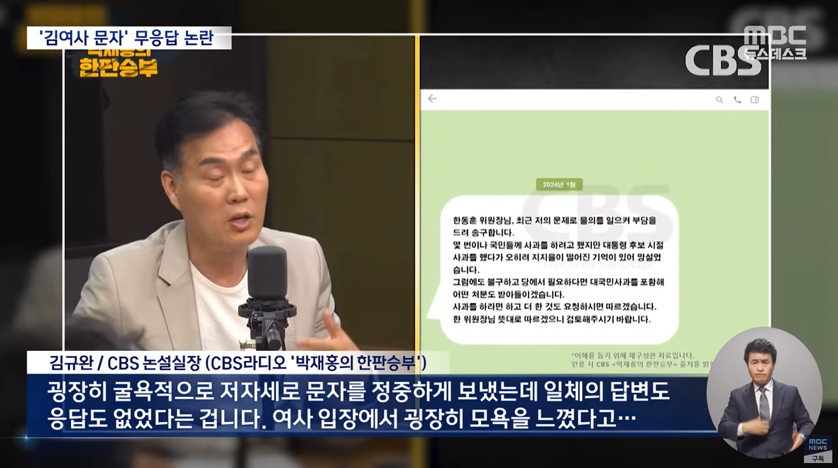 "굉장히 굴욕적으로 저자세로 문자를 정중하게 보냈는데 일체의 답변도 응답도 없었다는 겁니다. 여사 입장에서 굉장히 모욕을 느꼈다고…"