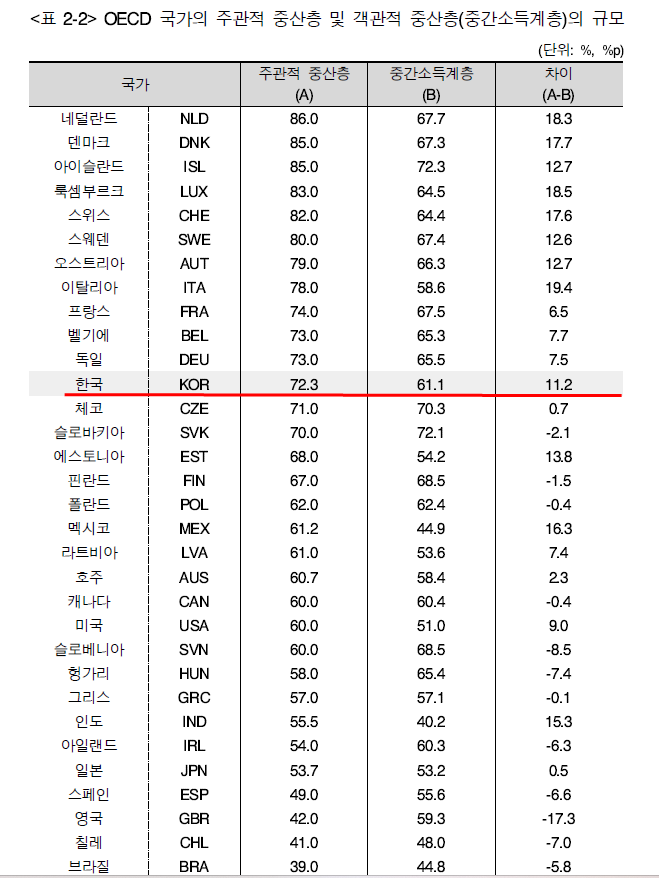 즉, 객관적 상층의 상당수가 자 신을 중산층으로 간주하고 있으며, 따라서 대부분의 국가에서 ‘주관적’ 중산층에는 ‘객관적’ 상층의 다수가 포함되어 있을 가능성이 있다.