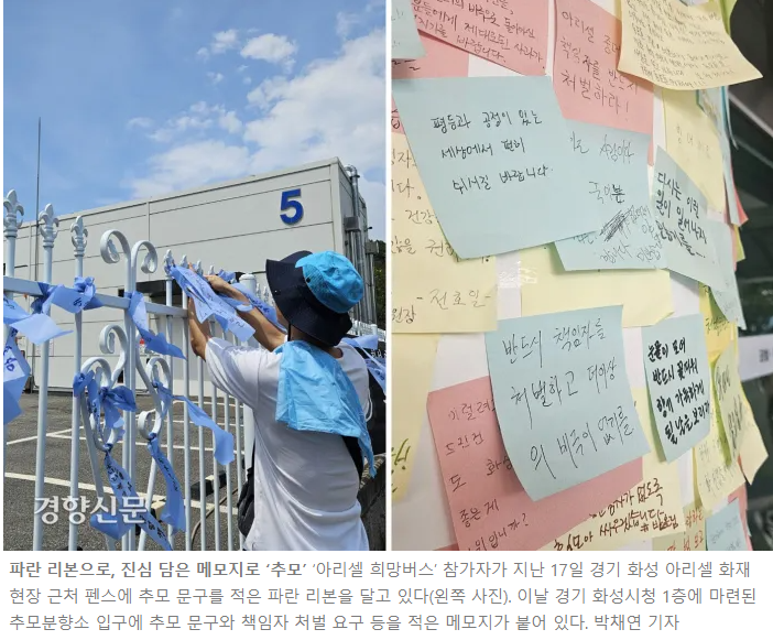 지난 17일 오후, 여전히 불탄 2층의 흔적이 적나라하게 남아 있는 화성 아리셀 리튬전지 공장 앞으로 전국 곳곳에서 사람들이 모였다. 이날 주최 추산 약 50개 도시에서 출발한 버스·승합차 100여대가 2500명가량을 태우고 왔다. 이들은 영정이 줄지어 있는 분향소에서 묵념 후 하얀 국화를 내려뒀다. ‘진심 어린 사과만이 진실을 여는 첫걸음’ ‘안전한 세상이 되길’ 등 각각의 바람이 담긴 문구를 파란 리본에 눌러 담아 공장 펜스에 걸었다.