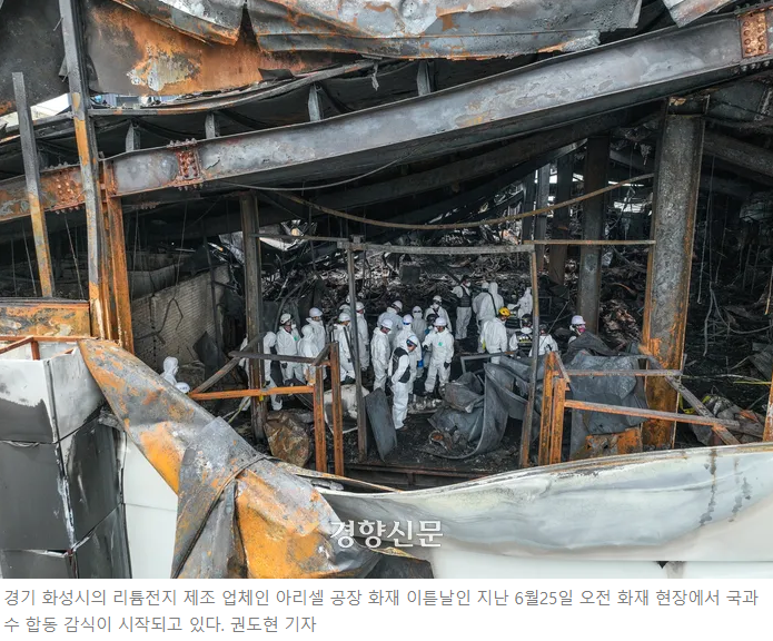 경기 화성시의 리튬전지 제조 업체인 아리셀 공장 화재 이튿날인 지난 6월25일 오전 화재 현장에서 국과수 합동 감식이 시작되고 있다. 권도현 기자