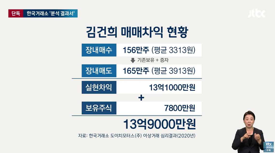 3. 도이치모터스 주가조작을 통해, 김건희 13억 9천만원 . 김건희 최은순씨 두 사람 합쳐서 23억원 가량 이익을 남겼다는 보고서. (한국거래소 분석 자료)