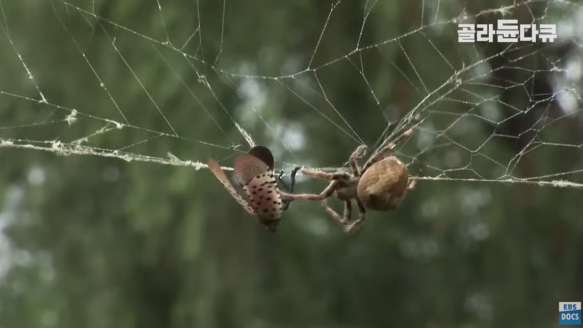주홍날개 꽃매미도 반갑지 않은 손님이다. 꽃매미를 잡아먹는 산왕거미.