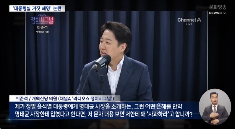 윤석열 대통령 부부에게 명태균 씨를 소개해 준 것으로 지목된 이준석 의원도 "대통령실의 해명은 새빨간 거짓말"이라며, 당시 명 씨가 윤석열 후보의 입장을 전달하면서 "사과하라"고 요구하는 문자를 공개했습니다.