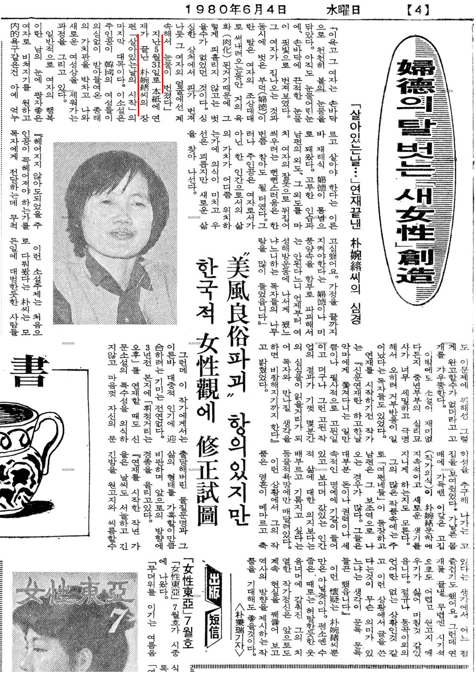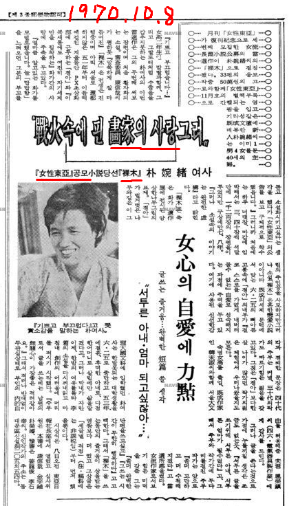1970년. 10월. 8일. 박완서 첫 소설, '나목'이 여성동아 공모 소설부문에 당선됨.