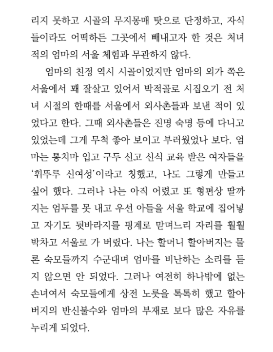 나는 처음에는 박완서가 서울 여자라고 생각했으나, 서울 여자가 아니었다. 박완서는 극성 치맛바람 엄마따라 개성 근처 (개풍군)에서 서울 현저동으로 이사를 왔다.