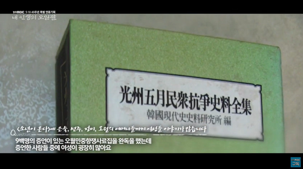 소년이온다. 소설 준비하면서 한강 작가가 본 자료들. " 광주 오월 민중항쟁 사료전집 " - 900명의 증언.