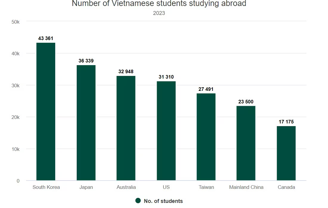 베트남 교육훈련부에 따르면 작년 해외 유학을 떠난 베트남 유학생은 20만명으로 2020년보다 1만명 늘었습니다. 그 중 4만3361명이 한국으로 떠났습니다. 다음이 일본(3만6339명), 호주(3만2948명), 미국(3만1310명)이었지요.