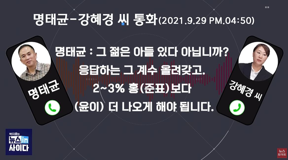 15일 <뉴스토마토>가 확보한 명씨와 강씨 간 통화녹음 파일에 따르면, 명씨는 2021년 9월 강씨에게 전화를 걸어 국민의힘 대선 후보 적합도에서 윤석열 대통령 지지율이 홍준표 대구시장보다 2~3%포인트 높게 나오도록 여론조사 결과를 만들 것을 지시했습니다.