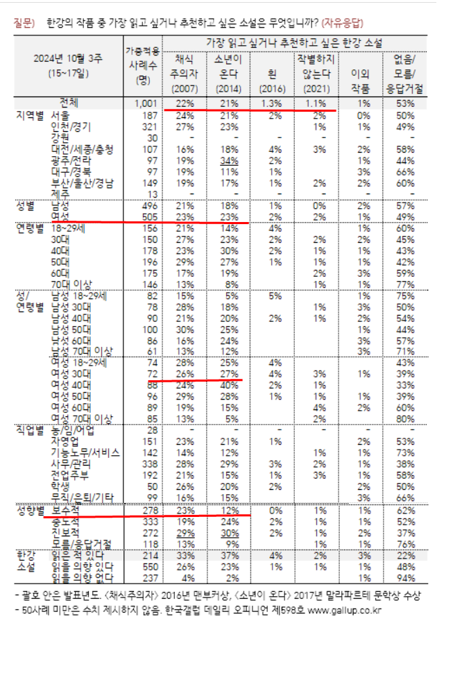 흥미로운 여론조사. 한강 소설책 추천. 보수성향 '채식주의자' (23%) '소년이온다 ' (12%)