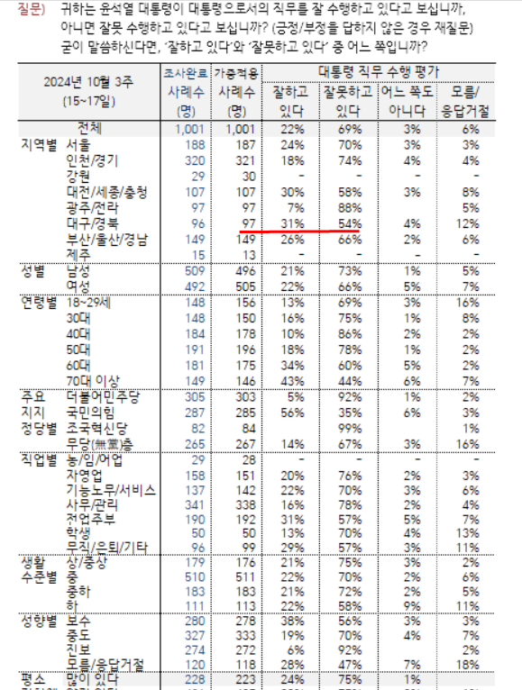 3주 전과 비교하면 부정 평가 이유에서 의대 증원 비중이 줄고, 김건희 여사 문제 언급이 늘었다. 이는 10월 국정감사 기간 중 김 여사 관련 의혹 공방과 명태균 등의 잇단 폭로 영향으로 보인다. 의대 증원 논의는 별다른 진척 없는 상태다.