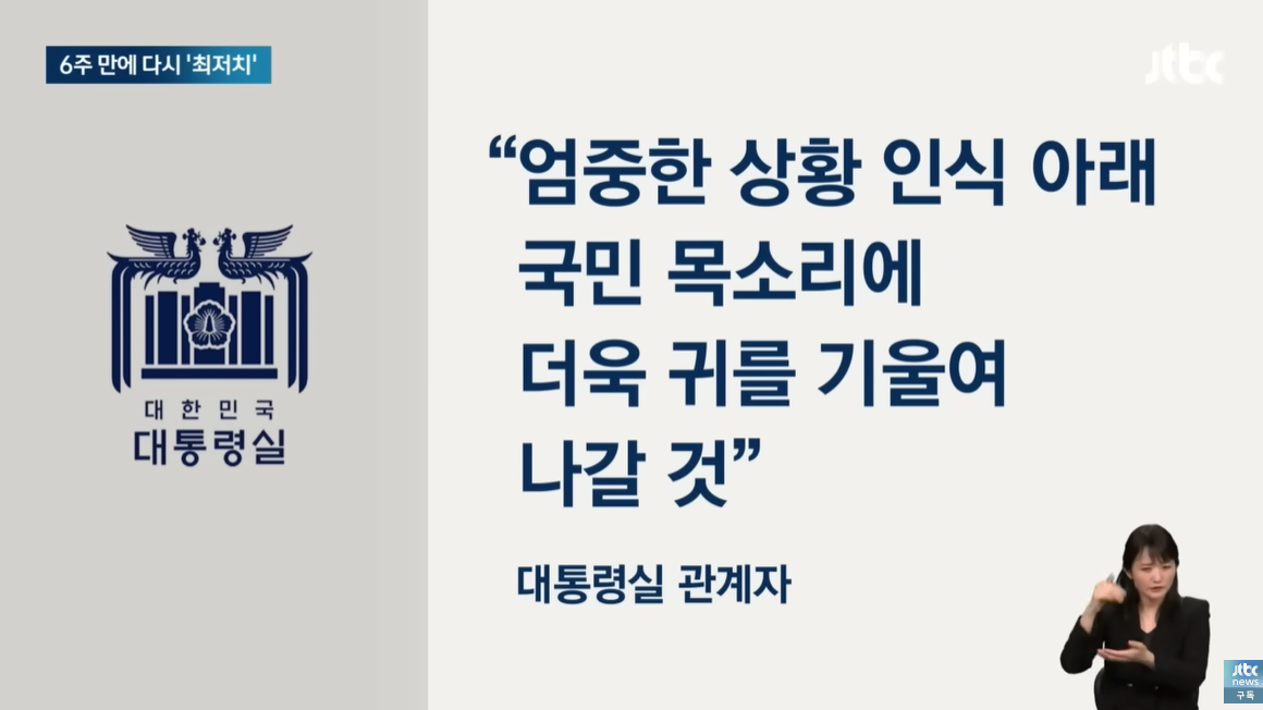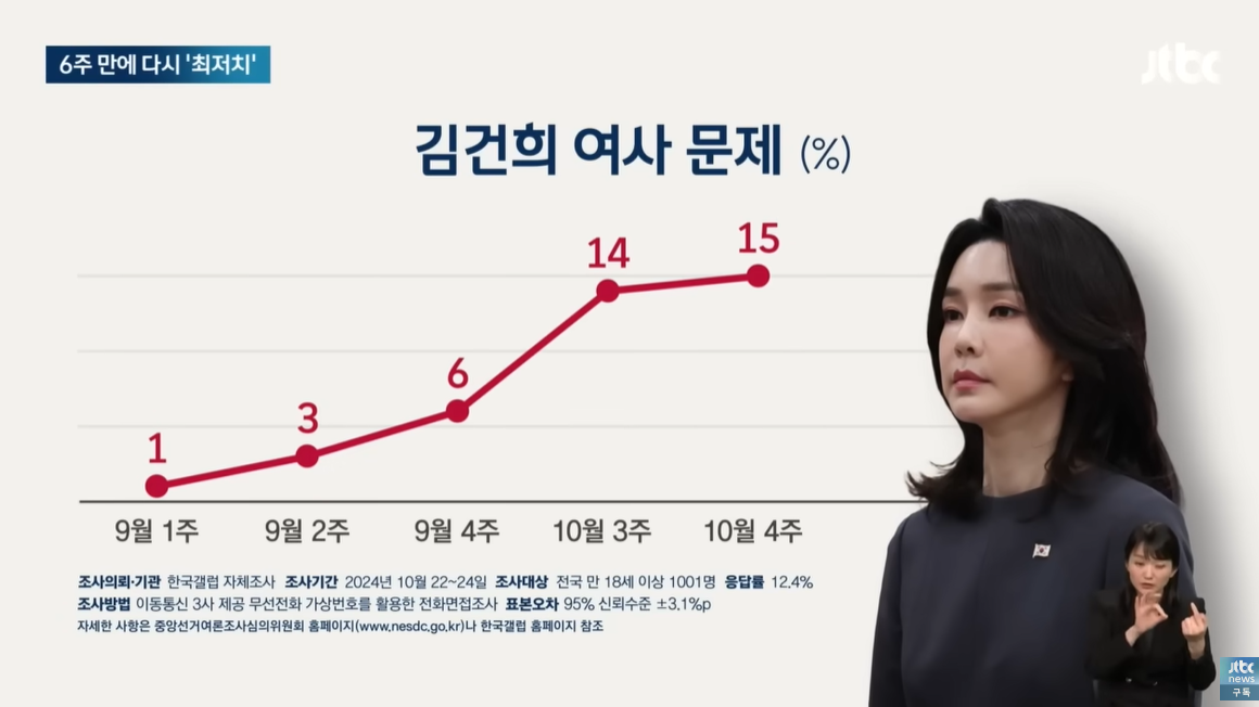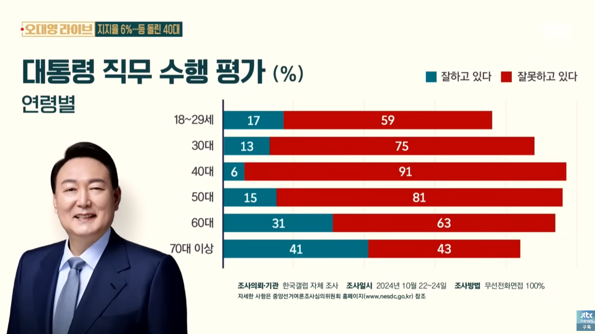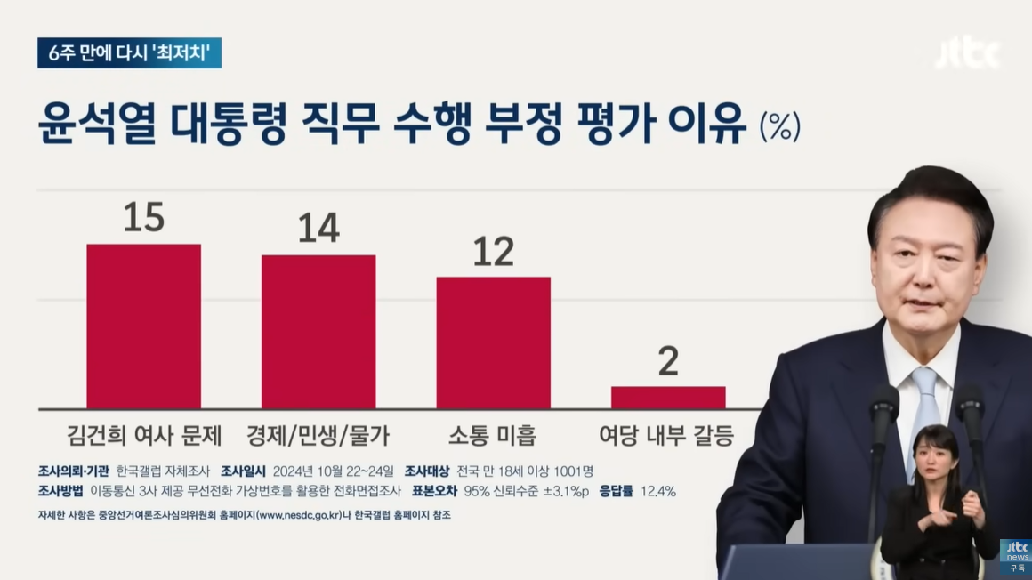 2024년 10월 28일~29일 윤석열 지지율 언론보도, 한국 갤럽 조사, jtbc