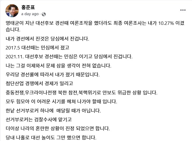 명태균이 지난 대선후보 경선때 여론조작을 했더라도 최종 여론조사는 내가 10.27% 이겼습니다.