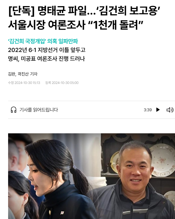 ‘김건희 여사 공천 개입 의혹’의 핵심 인물인 명태균씨가 2022년 6월 지방선거를 이틀 앞두고 “사모님(김건희 여사)이 궁금해한다”며 미공표 서울시장 여론조사를 진행한 사실이 확인됐다.
