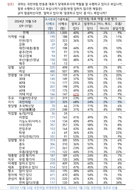 한동훈 잘하고 있다 (40%), 잘못하고 있다 (49%)