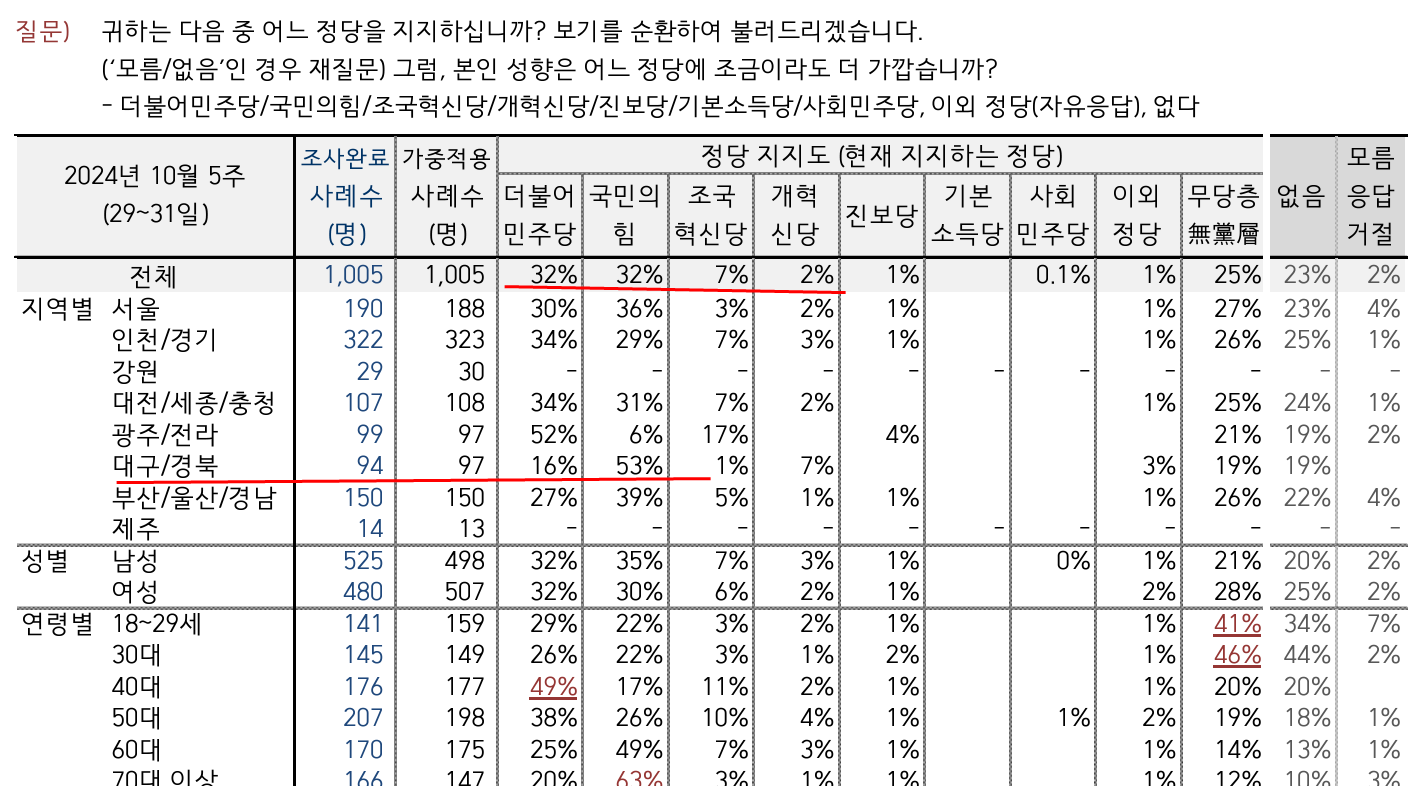 1.민주당 32, 국힘 32, 조국혁신당 7, 개혁신당 2,진보당 1 무당층 25