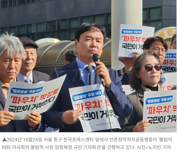 ▲2024년 10월24일 서울 중구 한국프레스센터 앞에서 언론장악저지공동행동이 '불법적 KBS 이사회의 불법적 사장 임명제청 규탄 기자회견'을 진행하고 있다. 사진=노지민 기자
