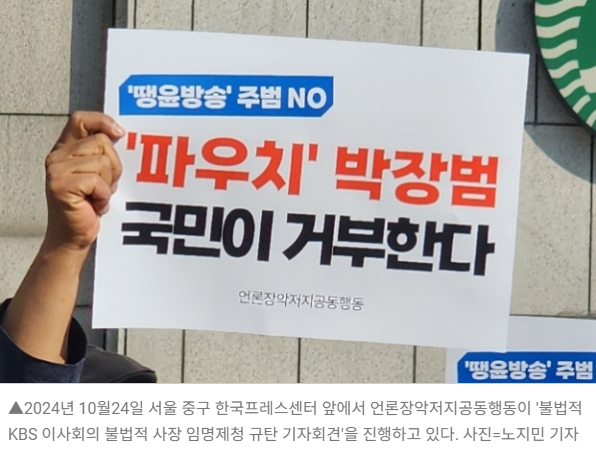 이른바 ‘파우치 앵커’로 불리는 박장범 KBS ‘뉴스9’ 앵커가 차기 KBS 사장으로 임명되어선 안 된다는 언론계 원로, 시민단체, 현업인 기자회견이 진행됐다. 24일 과거 군사독재정권에 맞선 언론인들의 자유언론실천선언 50주년 행사가 예정된 서울 중구 한국프레스센터 앞에서 92개 단체가 모인 언론장악저지공동행동(이하 공동행동)은 “공영방송 장악을 위한 위법적 KBS 사장 선임은 무효”라고 주장했다.
