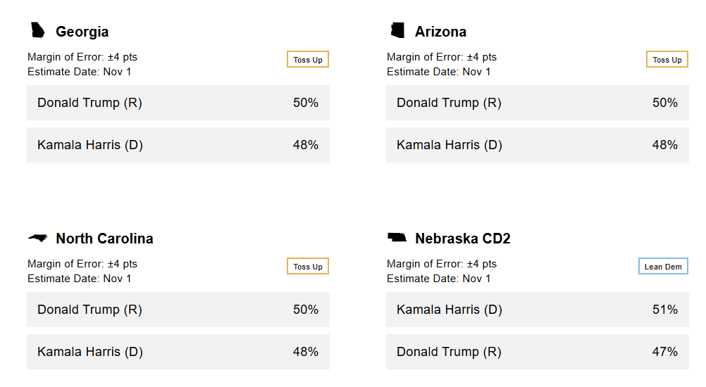 The findings below also include Nebraska's competitive 2nd Congressional District; Nebraska is one of two states, along with Maine, that allows splitting up its electoral votes.