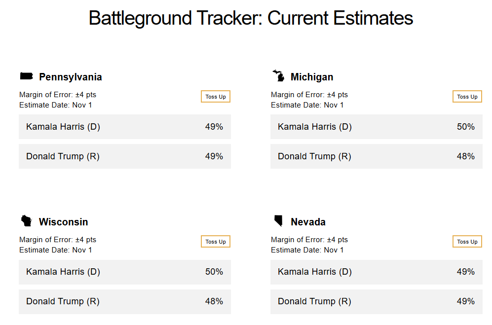 CBS News' Battleground Tracker provides the latest estimates of support for Harris and Trump in these states as the 2024 campaign comes to a close. Estimates are based on CBS News/YouGov polling and analysis.