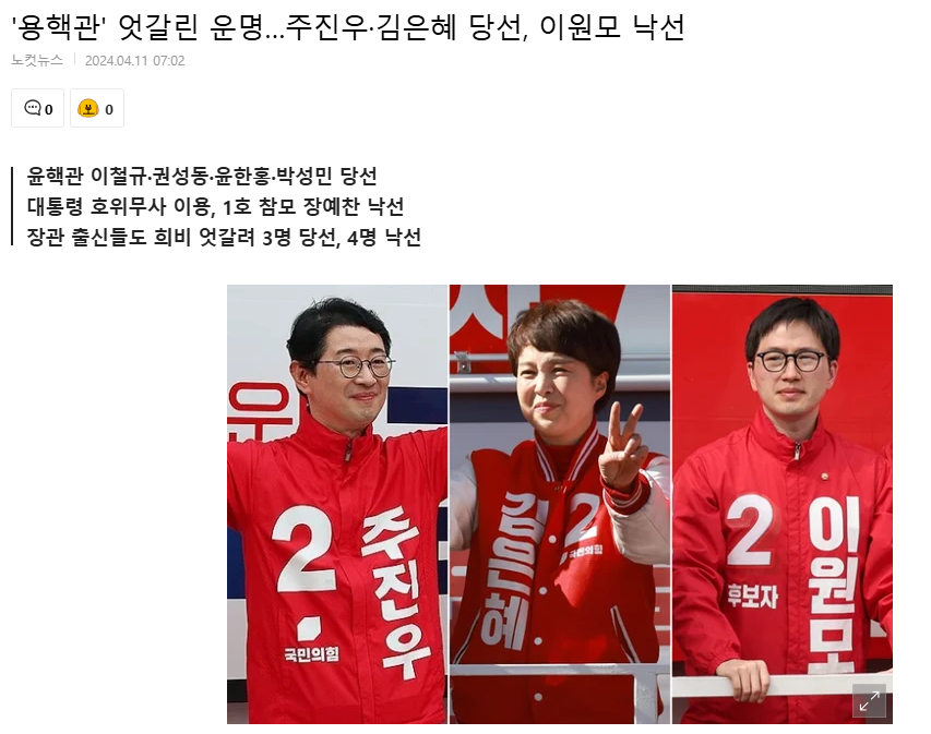 김대남 전 행정관은 올해 4월 총선에서 낙천했다. 2023년 10월20일 대통령실에 사직서를 내고 일찌감치 경기 용인갑 출마를 준비했으나, 국민의힘 공천관리위원회는 2024년 2월26일 이원모 대통령실 공직기강비서관(당시 인사비서관)을 이 지역에 우선 추천(전략공천)했다. 김 전 행정관은 이후 이원모 비서관 지지 선언을 하고 선거를 지원했다.