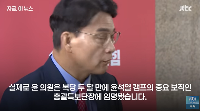 명씨는 당시 선거법 위반으로 재판을 받고 있던 윤 의원의 법정 구속을 막을 방법은 캠프 본부장뿐이라며 윤석열 대통령의 측근인 함성득 원장을 통해 윤 의원의 캠프 합류를 설득했다고도 주장했다. 윤 의원은 복당 두 달 만에 윤석열 캠프에서 중책인 총괄특보단장으로 임명됐다.