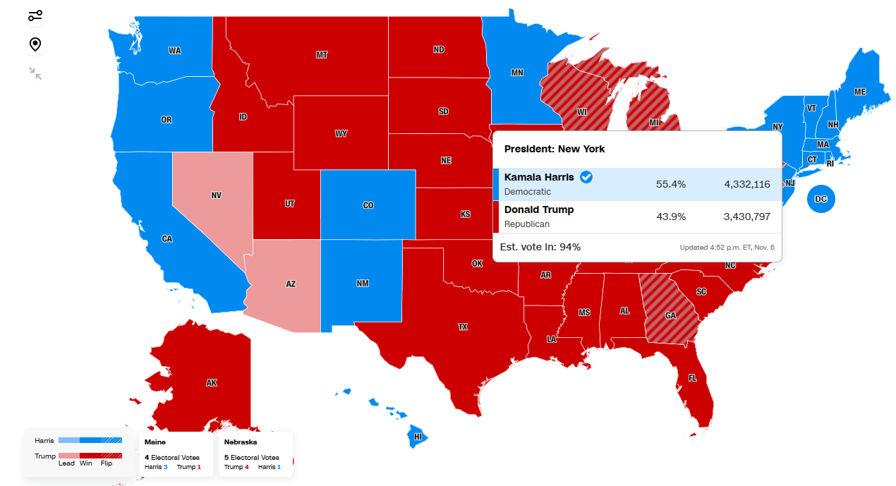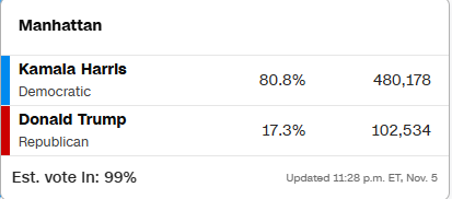 뉴욕주 전체. 해리스 55.4% (4,332,116 표) 트럼프 43.9% (3,430,797 표)