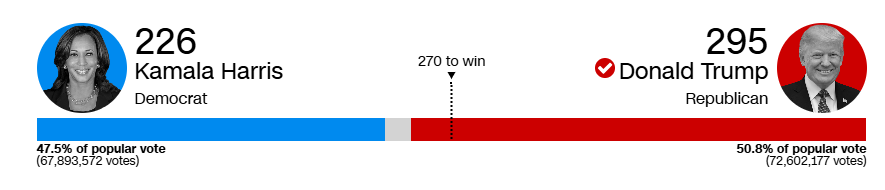 미국 전체. 해리스는 선거인단 226표, 트럼프는 과반수 270을 훌쩍 넘긴 295표 획득, 트럼프가 45대에 이어, 47대 대통령으로 당선되었다.