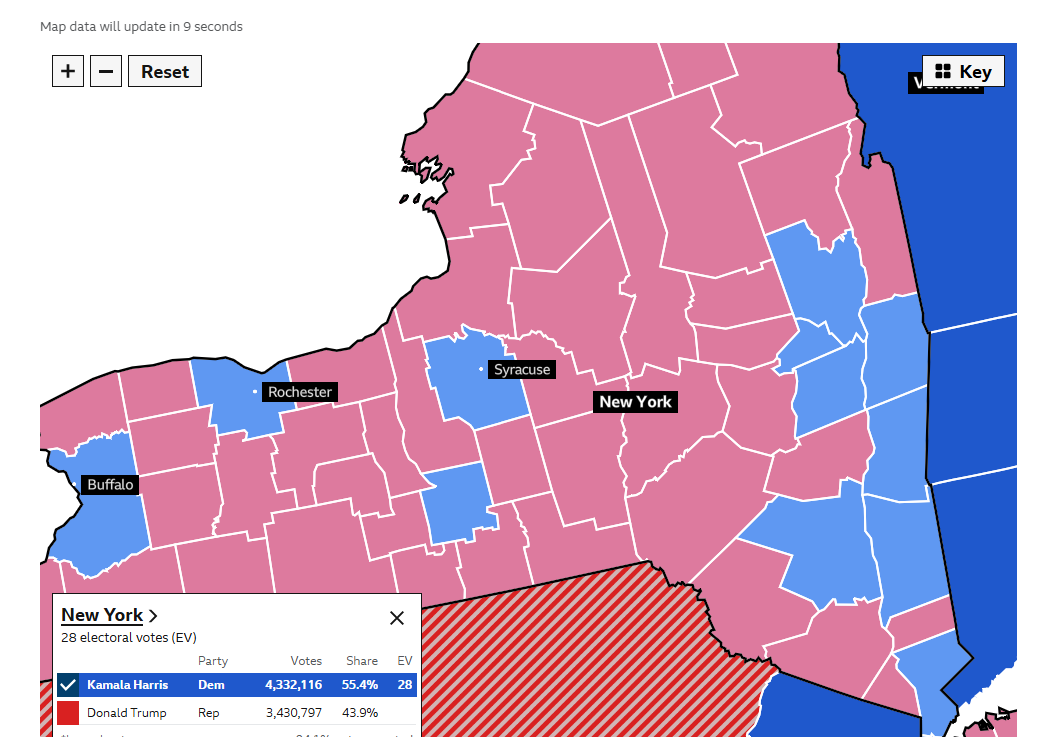 시라큐즈, 로체스터, 버팔로, 톰킨즈 등에서는 해리스가 트럼프를 이김.