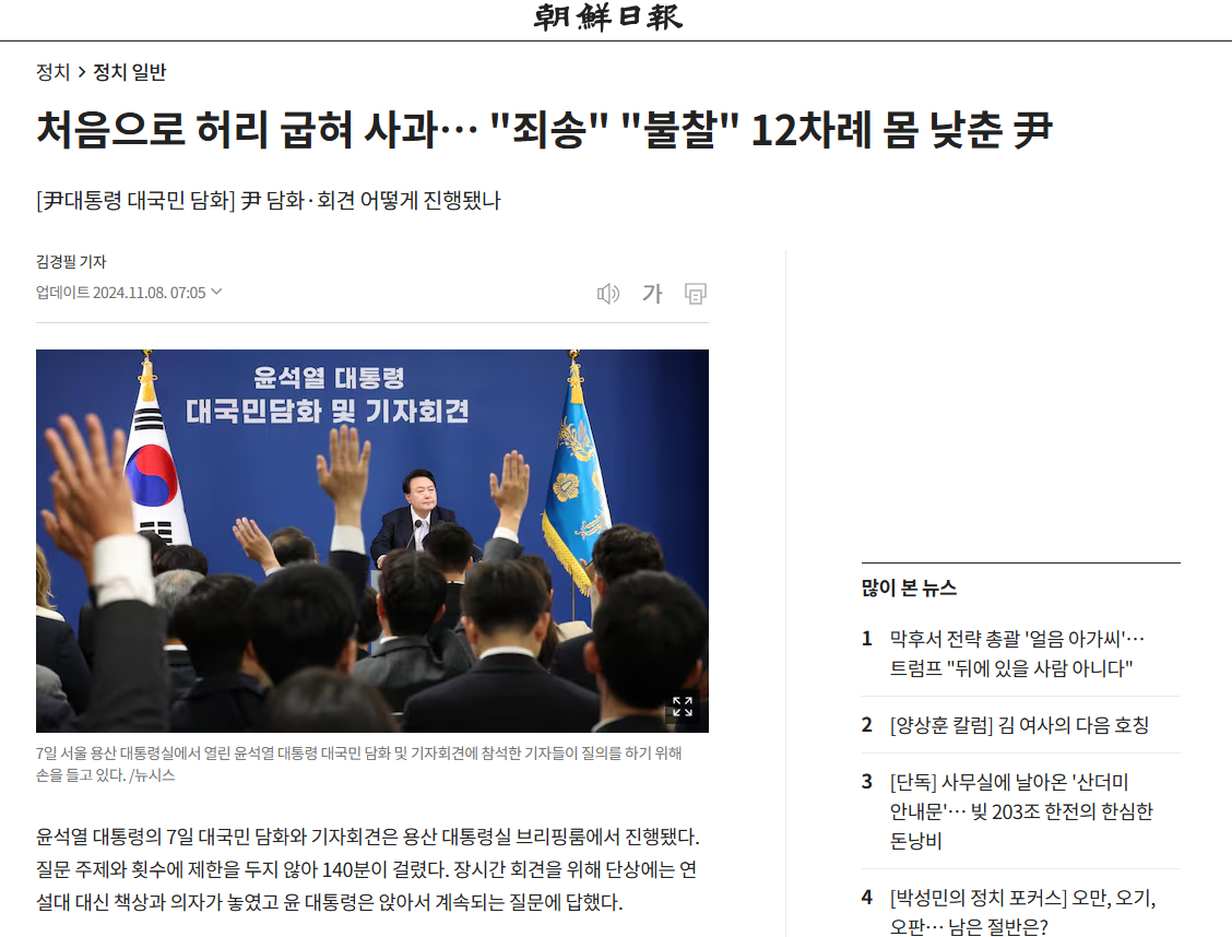 이날 회견에 대한 여론 반응이 썩 좋지는 않은 것 같다. 구체적으로 무엇을 사과하는지 밝히지 않은 채 두루뭉술 넘어갔고, 각종 의혹도 대부분 부인했다. 김 여사의 국정 개입 논란은 “침소봉대하고 악마화한 것이 있다”고 했고, 특검은 “정치 선동”이라고 했다. 명태균씨 의혹엔 “여론조사를 조작하거나 공천에 개입한 적이 없다”고 했다. 김 여사 문제나 공천 개입 의혹에 대한 일반 국민의 인식과 괴리가 적잖았다. 그러나 윤 대통령은 이날 각종 잘못을 인정하고 수차례 사과했다. 2시간 20분 동안 기자들의 질문에 끝까지 답하면서 소통하려는 노력도 보였다.