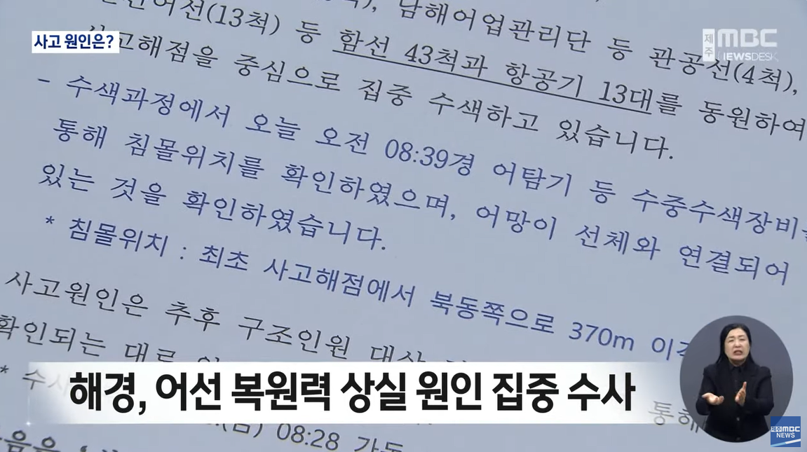 이어 김 수사과장은 “찰나에 복원성을 잃어버린 원인이 오로지 어획량 때문인지는 계속적으로 조사해 여러가지를 추가로 파악해야 하고, 인양 후 어선의 구조적 결함도 봐야 한다”면서 “해당 배는 같은 사고가 없었지만 많은 어획량으로 인한 침몰, 전복 사고는 종종 있다”고 말했다.